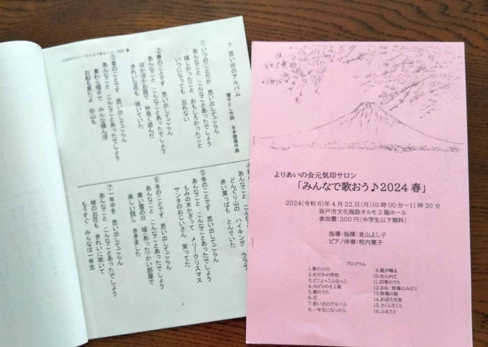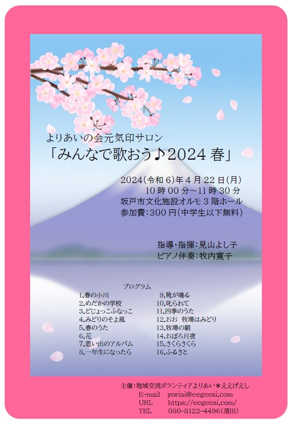 2024(令和6)年4月22日(月)、坂戸市文化施設オルモ3階ホールで「みんなで歌おう♪2024春」をおこないました。